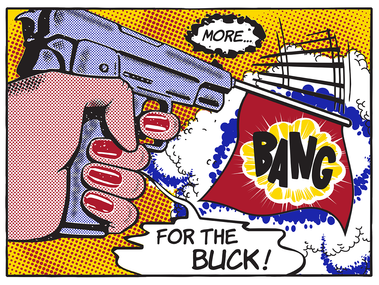 A graphic print design inspired by Roy Lichtenstein with a modern take. A tongue and cheek visual statement on the idiom "Bang for the Buck" gives it a whole new synonymous meaning. Traditionally the phrase means to get a good deal or great value for the money you pay.