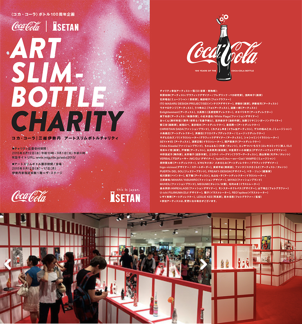 In August 2015, one of Tokyo's largest department stores, Isetan Mitsukoshi, created a special event to celebrate the milestone and the 2015 introduction of the slim aluminum bottle in Japan. An "Art Slim Bottle" exhibit featured the works of more than 80 Japanese artists who designed their own take on the slim bottle. All the pieces were then auctioned off to benefit the charity Home of Art for Kids, a non-profit that supports art education in Tojoku, a region affected the by the earthquake in 2011. Merchandise featuring some of the Coca-Cola art was also available for purchase at the exhibit including shirts, mugs and tote bags.