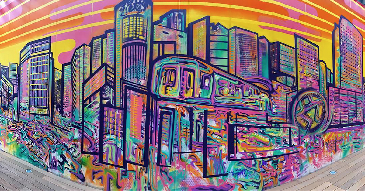 An abstract skyline mural of Shibuya at the Shibuya Edge building in Tokyo, Japan.