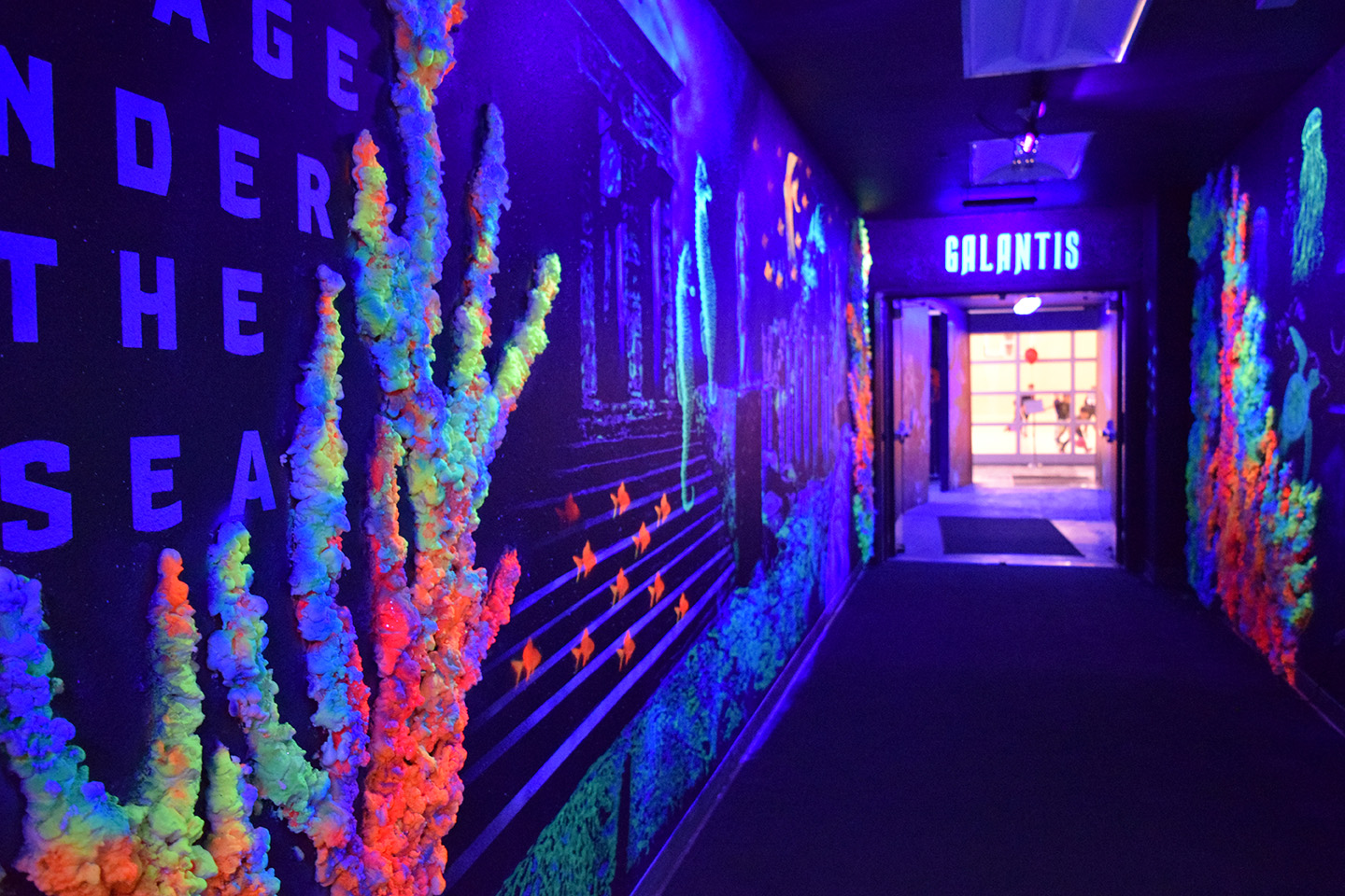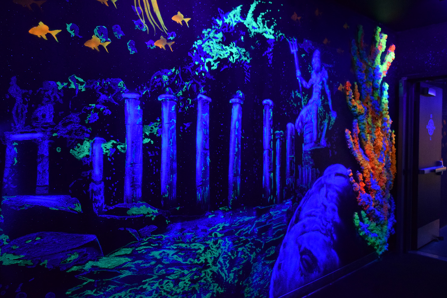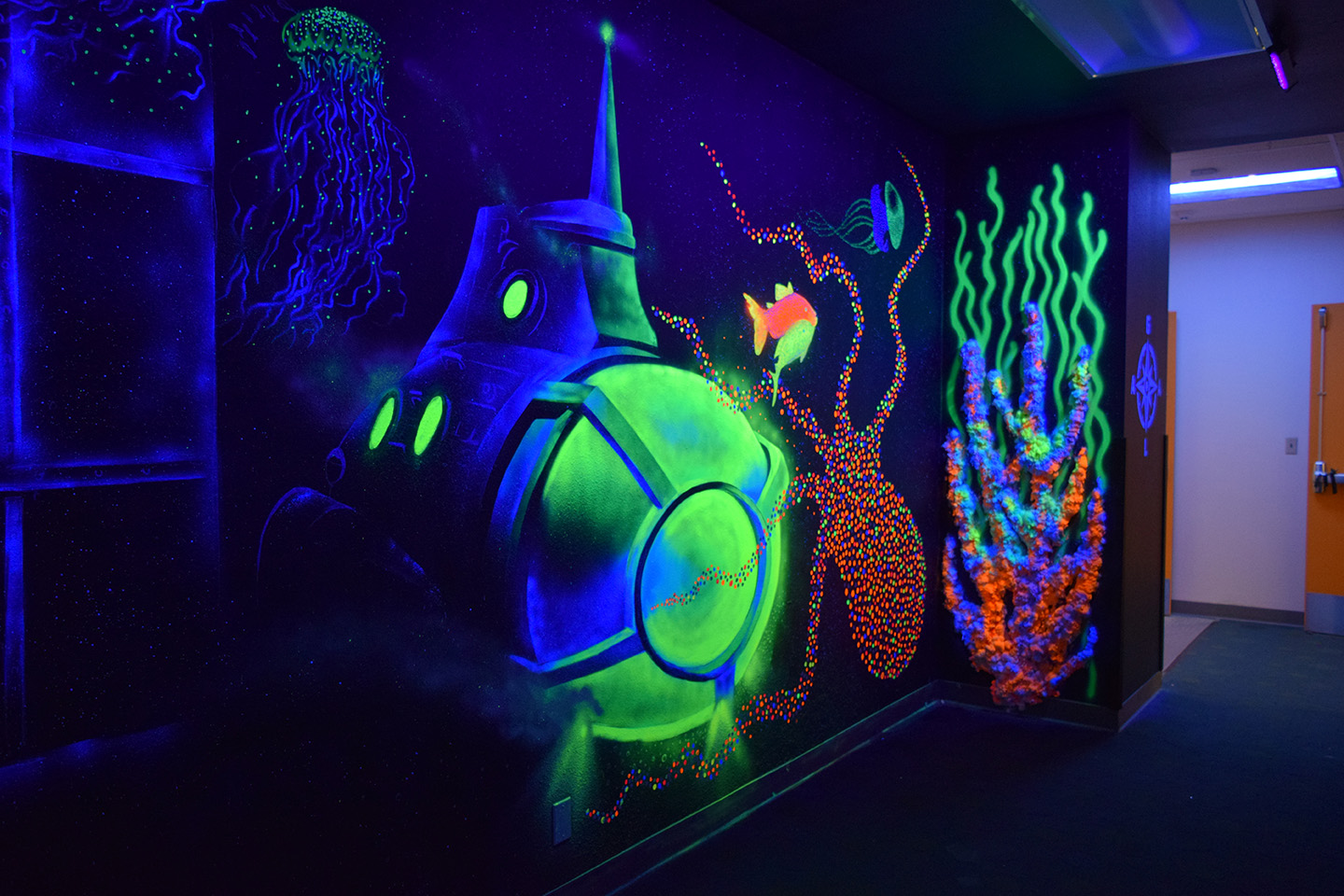 Mural painted at a private school in Los Angeles. The design is a typographic collage of letters. The words make up the four core values of the school: Inclusion, Responsibility, Caring, and Inclusion.