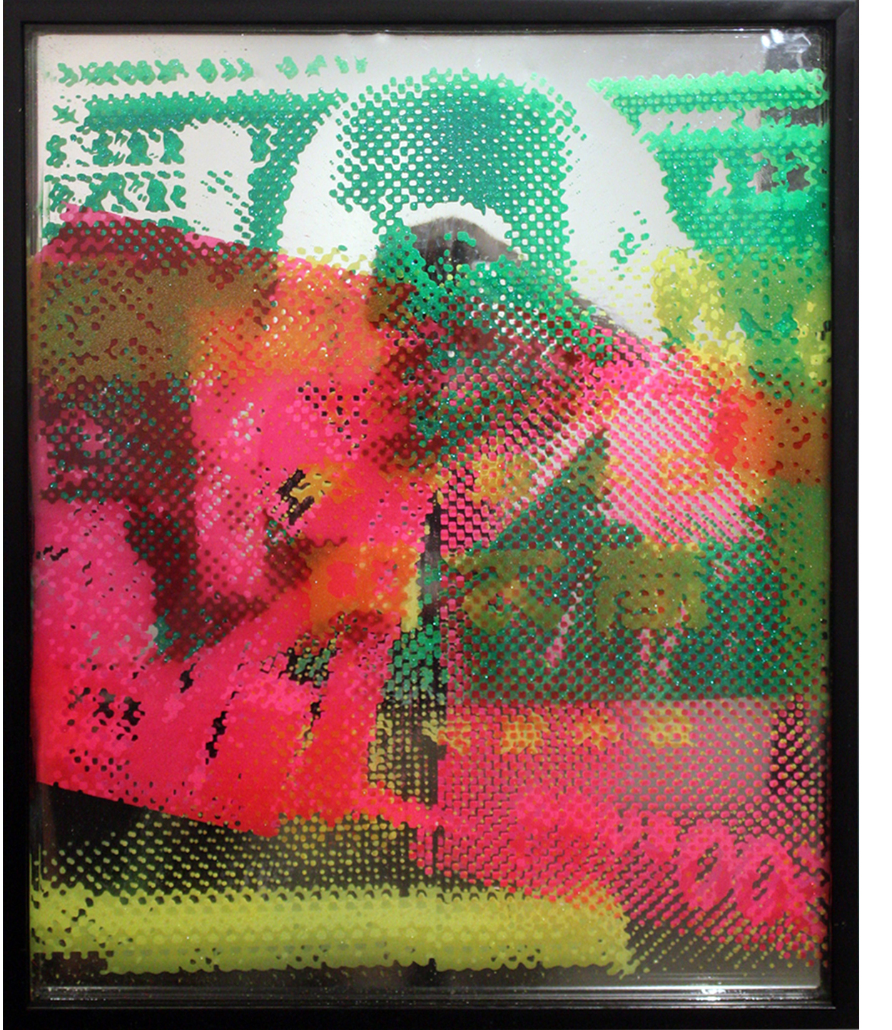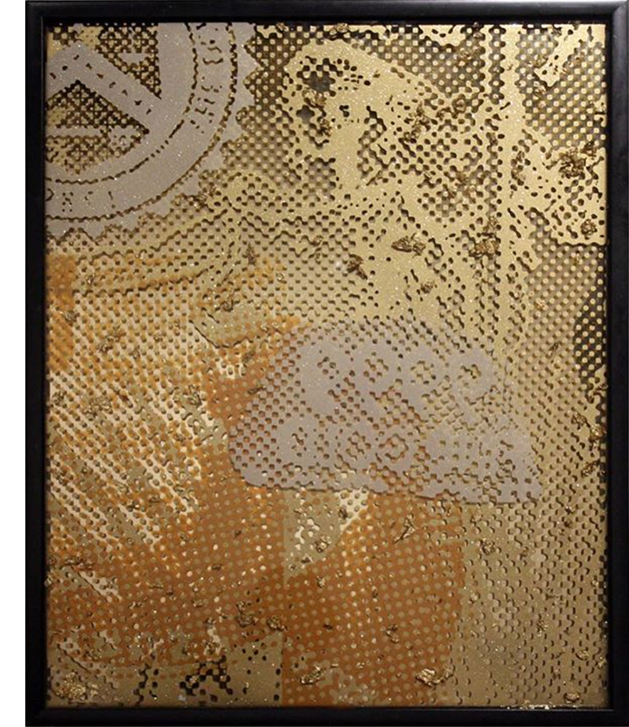 These mixed media pieces are made from 3 layers of clear resin poured in to a shadow box with transparent enamel paint in betwen each layer of resin. Each layer casts a slight shadow creating a dimensional overlap of imagery. The one on the left is titled the "Exhcange" and the right is titled "In Gold we Trust".